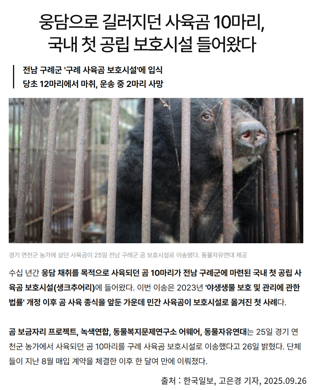 2019년까지만해도 환경부는 사육곰 문제를 이미 끝난 문제라고 버텼습니다. 모든 곰을 중성화했으니 마지막에 태어난 곰이 합법적 도살 연령인 10살이 되면 곰이 모두 도살되어 사육곰 산업이 알아서 끝날 거라 했습니다. 미필적 고의에 가까운 소리였습니다. 산업은 끝날 기미가 없었습니다.